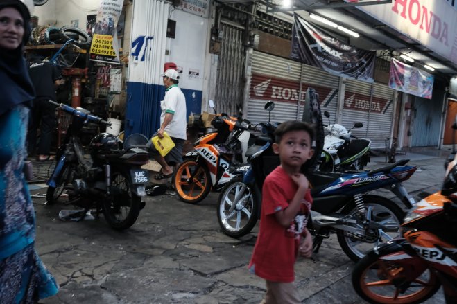 At the motorbike shop, Alor Setar, Malaysia Mother and son pick up their motorbike at a repair shop in Alor Setar, Malaysia.