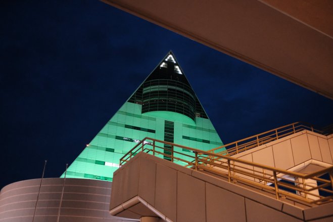 Triangle building and stairwell, Aomori, Japan The ASPAM tourism center viewed from under the highway in Aomori, Japan.