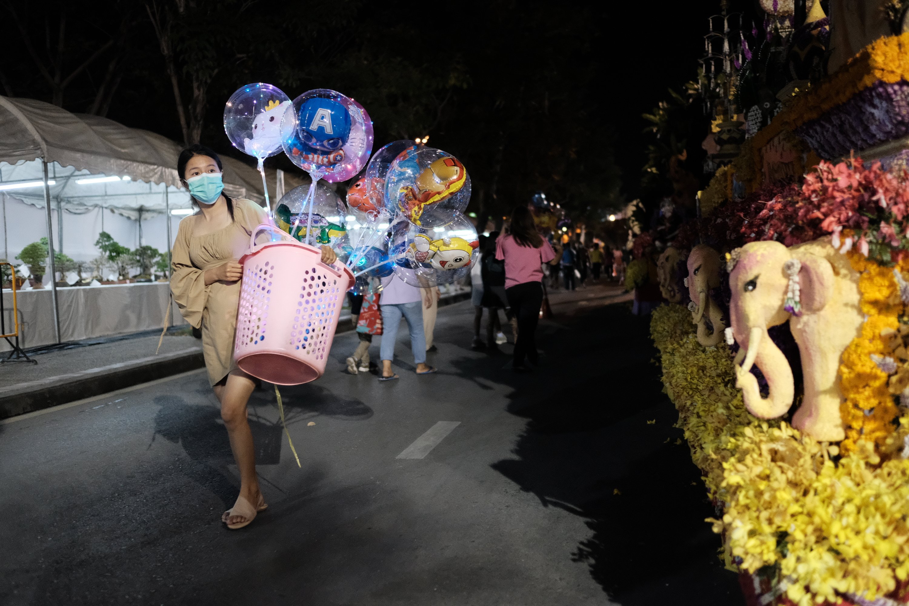 Woman with basket of balloons, Chiang Mai, Thailand A woman carrying a basket of balloons at the Flower Festival in Chiang Mai, Thailand.