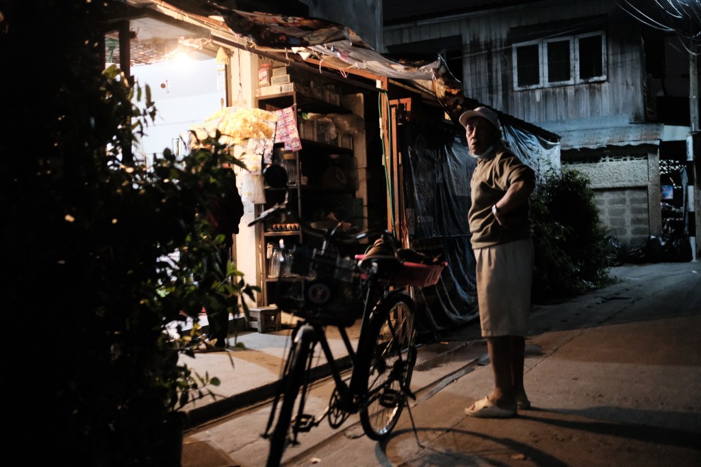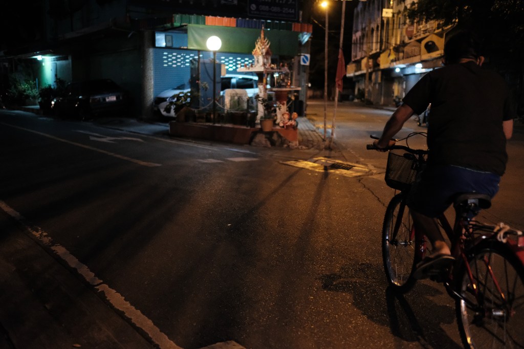 A boy sitting on the back of a bicycle in Bangkok, Thailand.