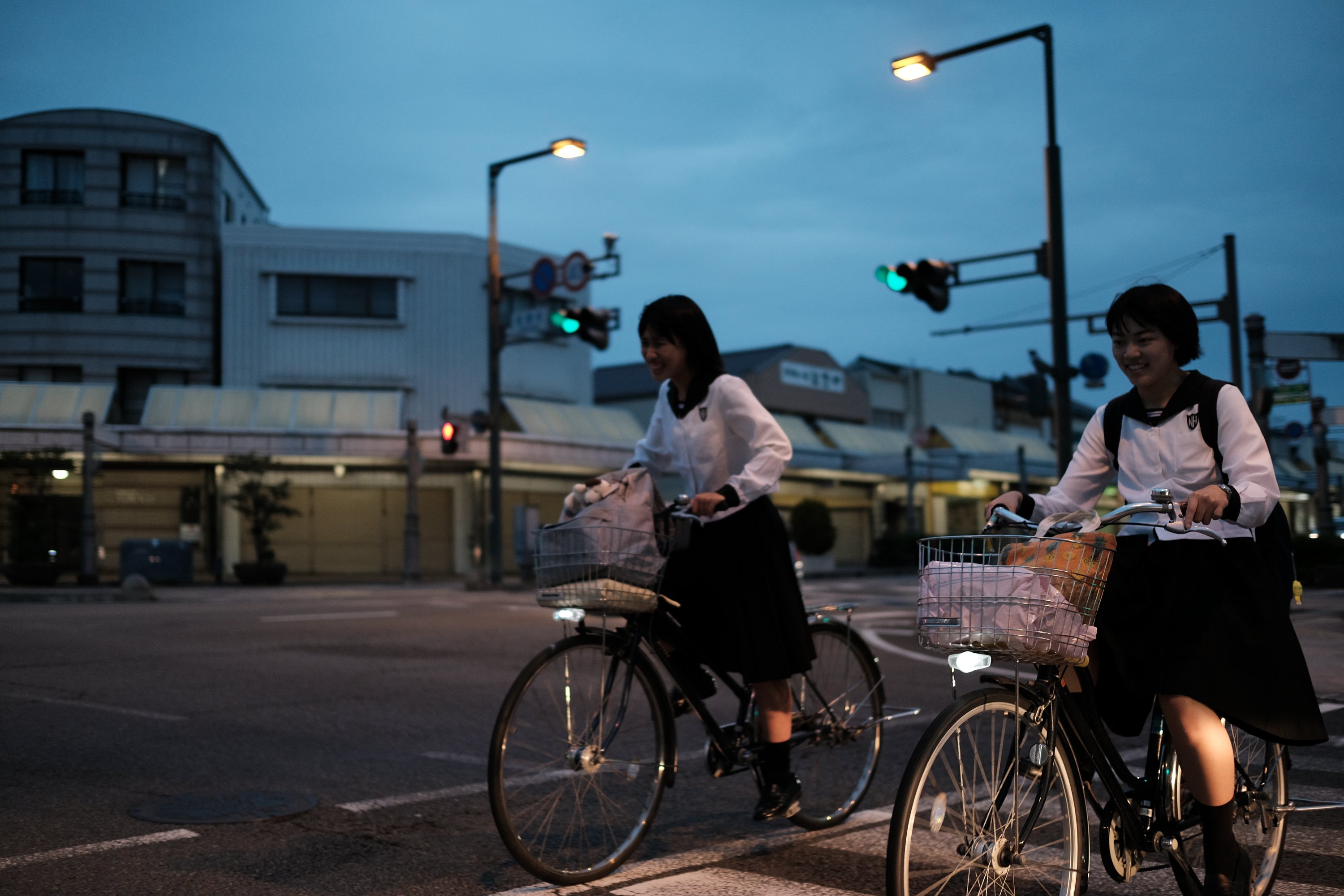 Schoolgirls on their bicycles, Nobeoka, Japan Two schoolgirls riding their bicycles in Nobeoka, Japan.