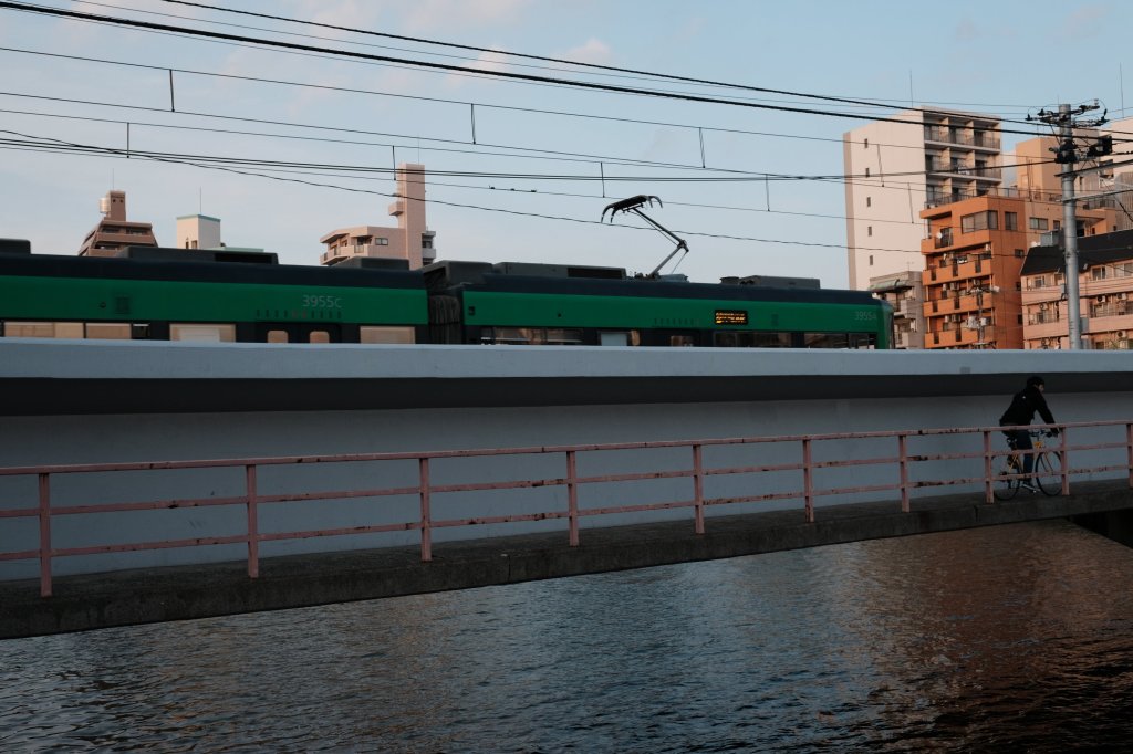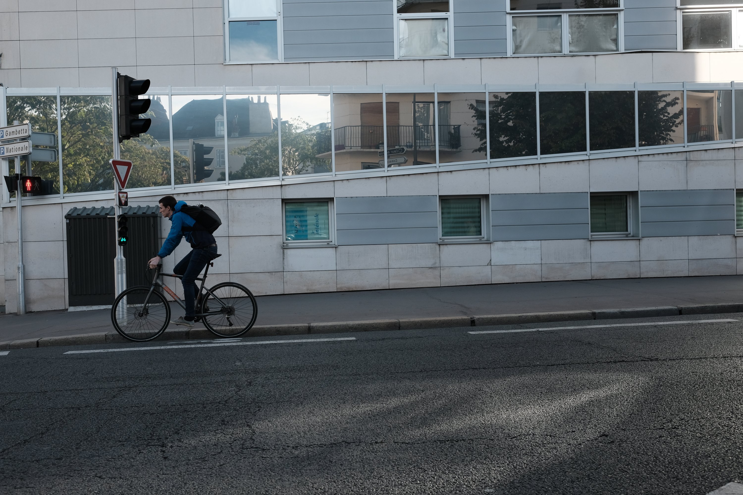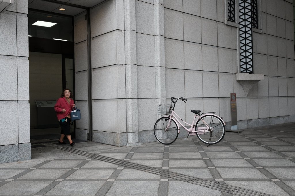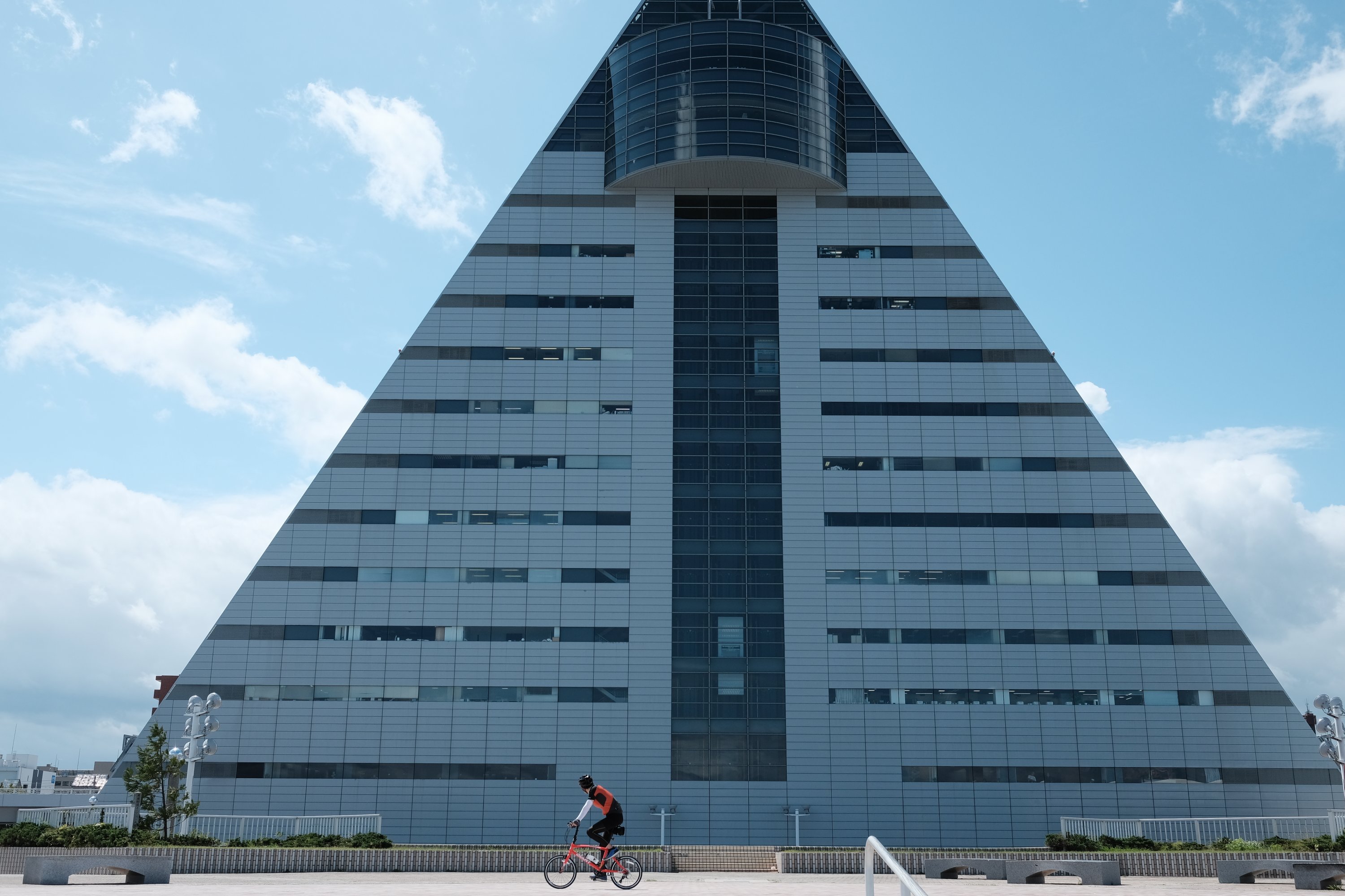 Cyclist and triangle building, Aomori, Japan A cyclist passes by the ASPAM tourism center in Aomori, Japan.