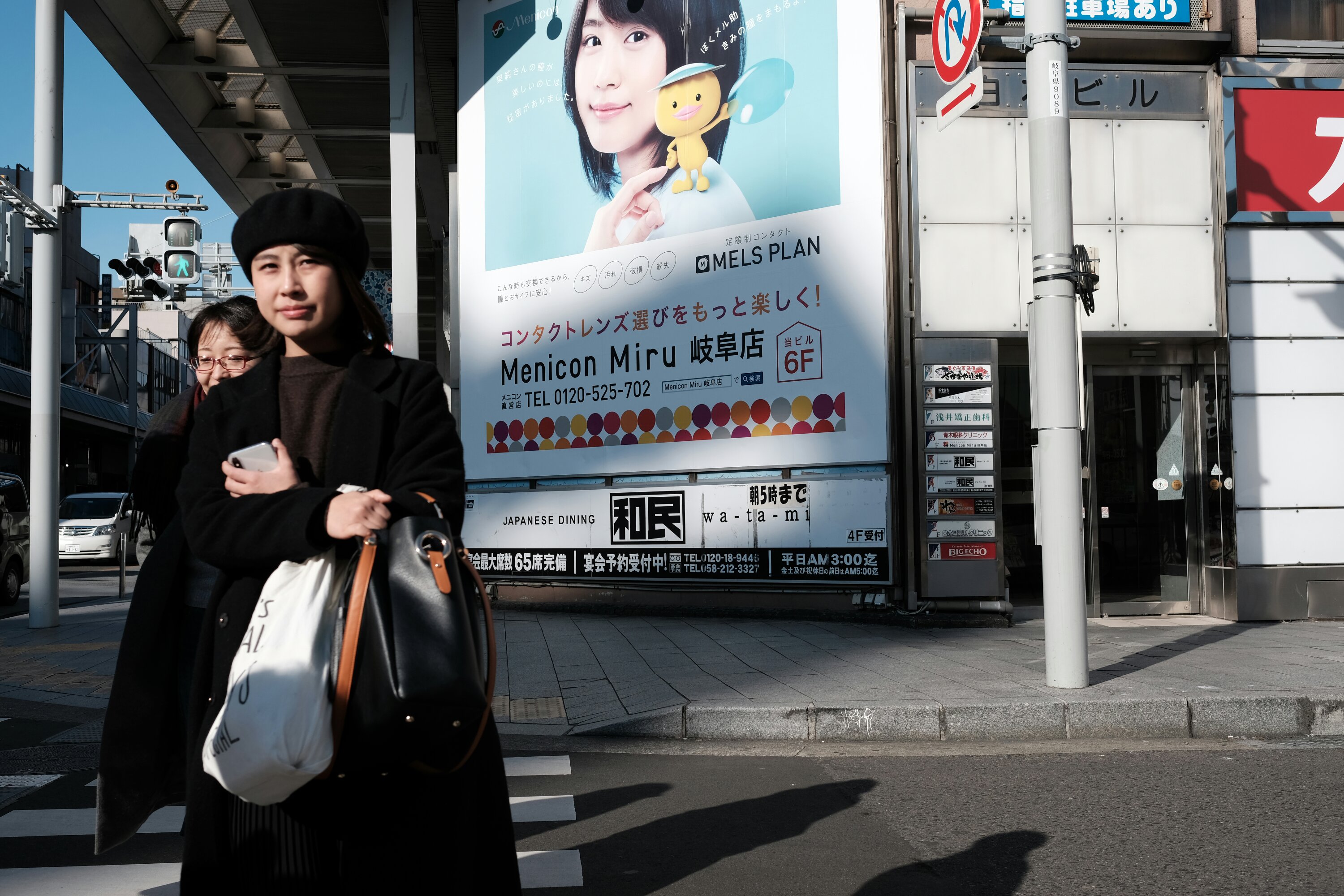 A large billboard overlooks a crosswalk in downtown Gifu, Japan.
