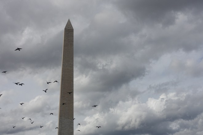 Flock of birds, Washington DC, USA A flock of birds flies by Washington Monument in Washington DC, USA.