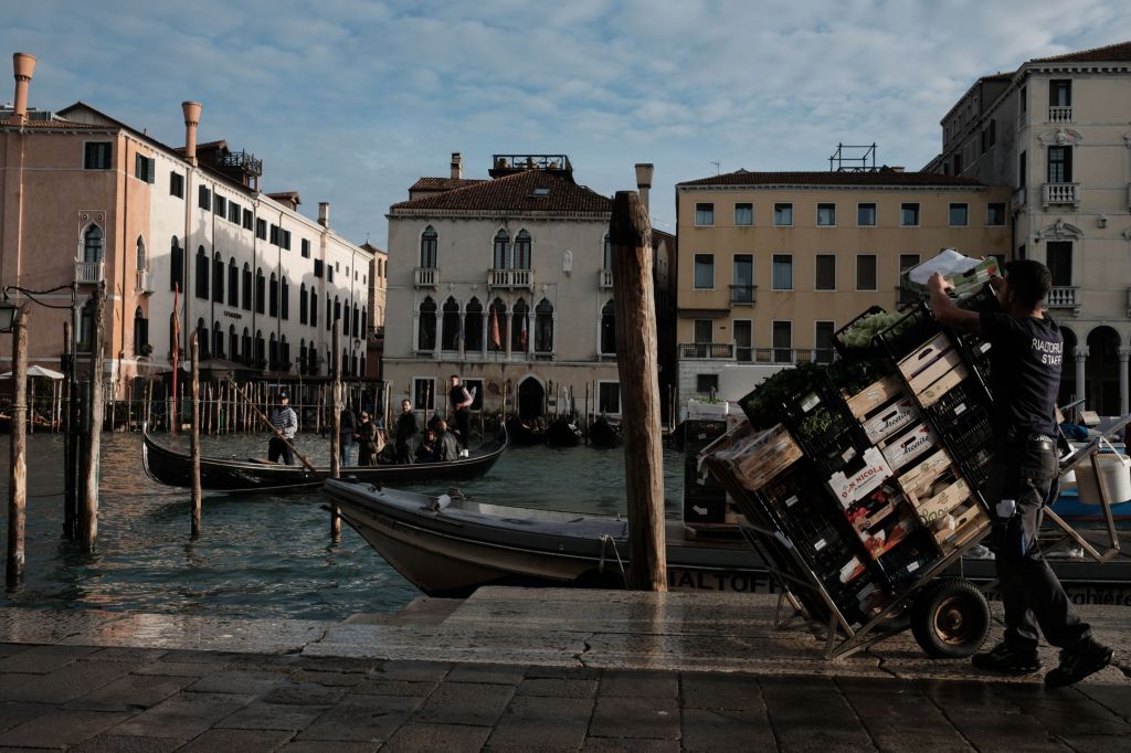 A worker loading crates at Mercato di Rialto (Rialto Market) in Venice, Italy.