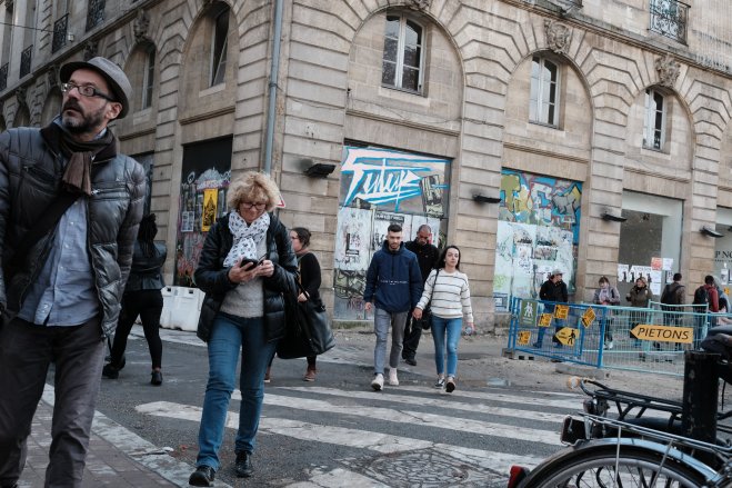 Intersection construction, Bordeaux, France People at an intersection under construction in Bordeaux, France.