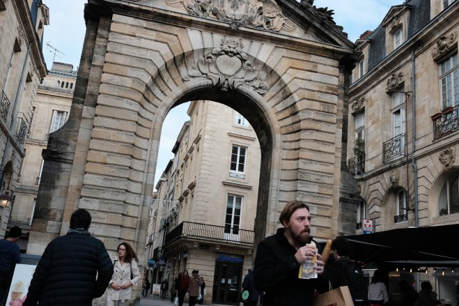 Man eating bread, Bordeaux, France A man eating bread while passing through the Porte Dijeaux in Bordeaux, France.
