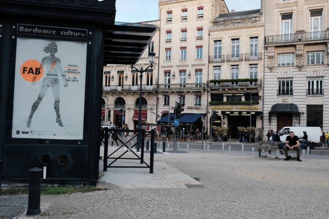 Poster and man sitting on bench, Bordeaux, France A poster and a man sitting on a bench in Bordeaux, France.