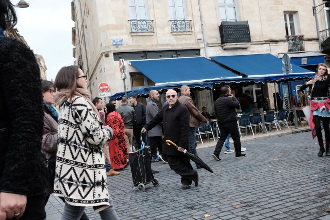 Man with umbrella, Bordeaux, France A man with an umbrella standing in Place Cantaloup in Bordeaux, France.