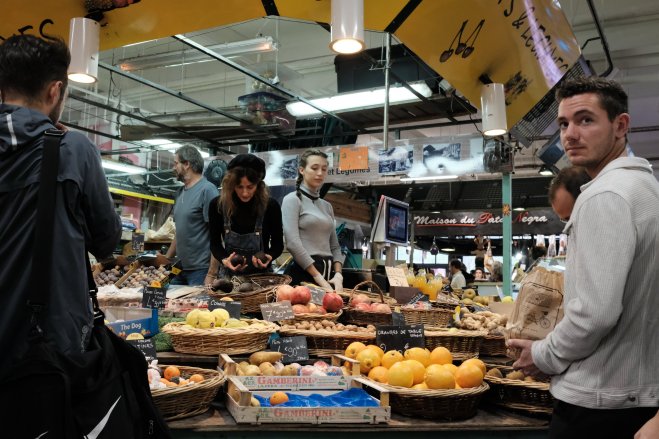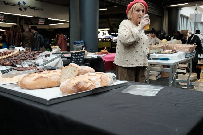 Bread and lady with red beret, Bordeaux, France A lady in a red beret at Marché des Capucins in Bordeaux, France.