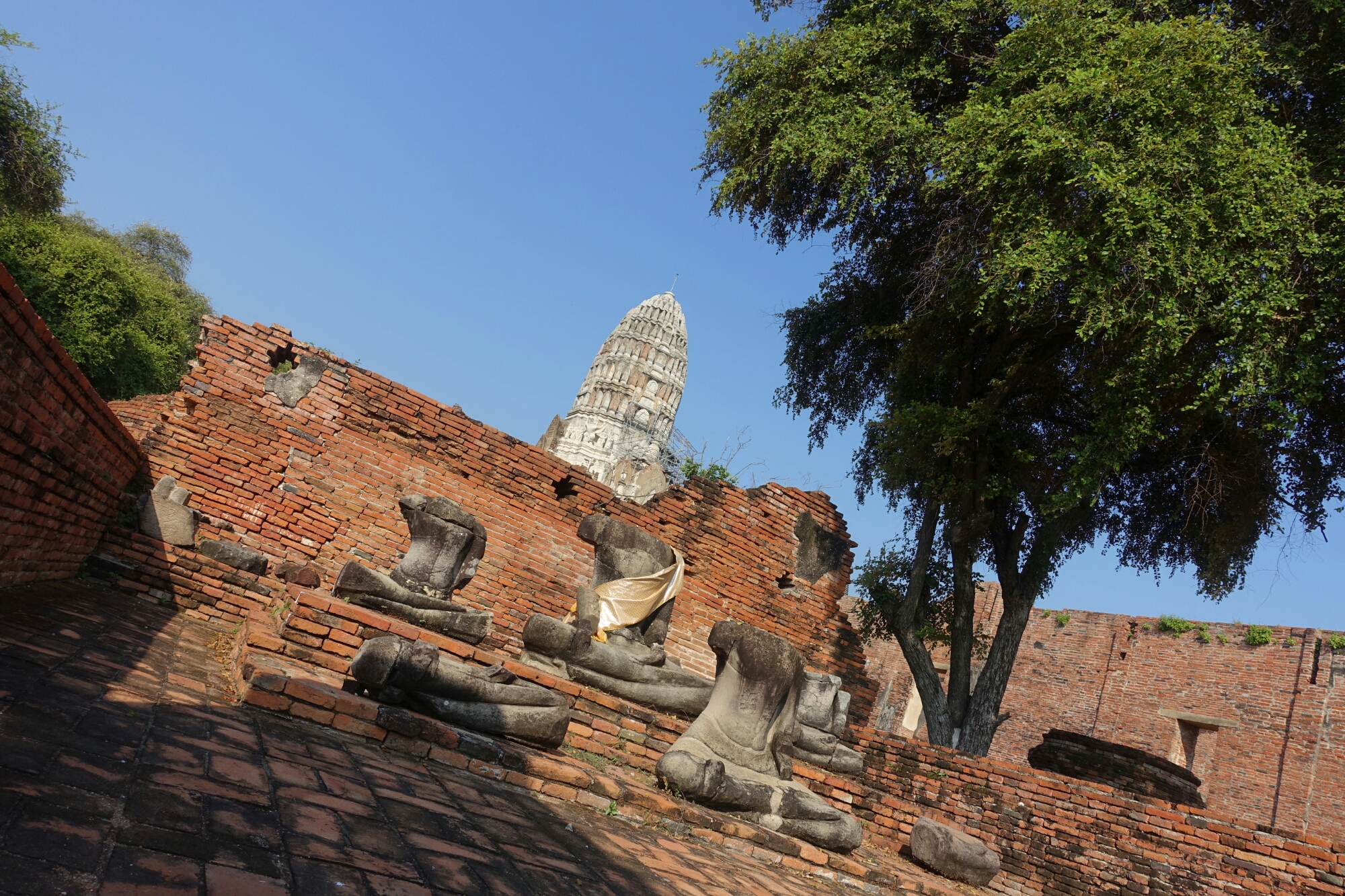 Broken Buddha statues, Ayutthaya, Thailand With the main prang of Wat Ratchaburana in the background, broken Buddha statues and fallen walls hint at golden age long past in Ayutthaya, Thailand.