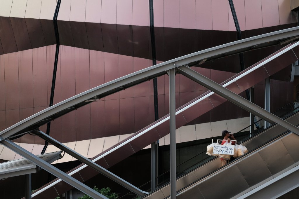 A man with popcorn on an escalator in Bangkok, Thailand.