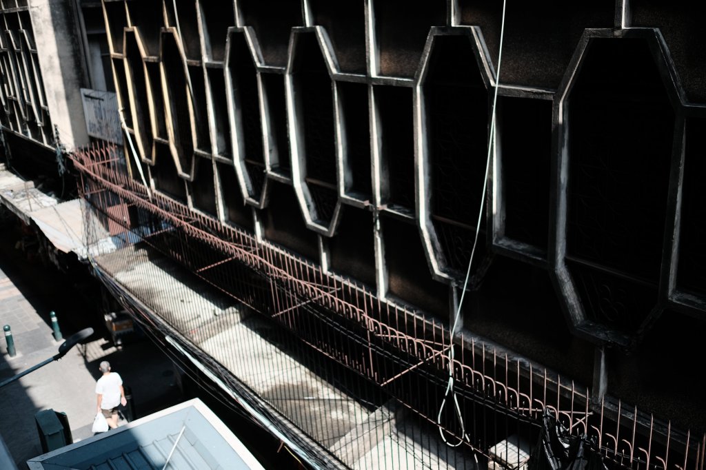The roof of Hakata Sennen-no-mon Gate and a parking sign in Fukuoka, Japan.