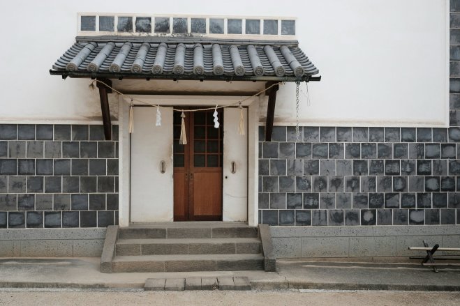 A building with blue tiles adorning its wall at the Achi Shrine in Kurashiki, Japan.
