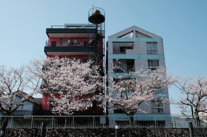 Cherry blossom trees in front of two apartment buildings in Kōchi, Japan.