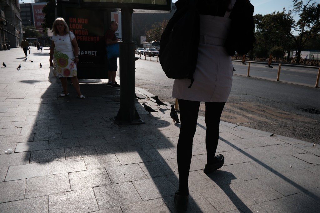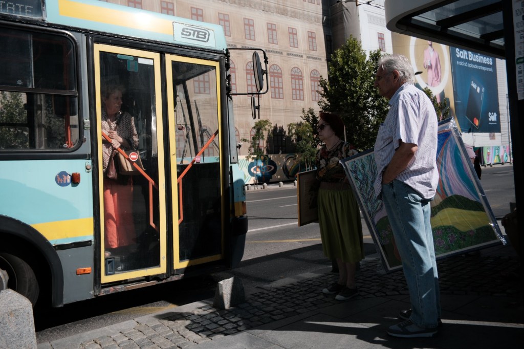 Ladies sitting on a bench at a tram stop in Lisbon, Portugal.