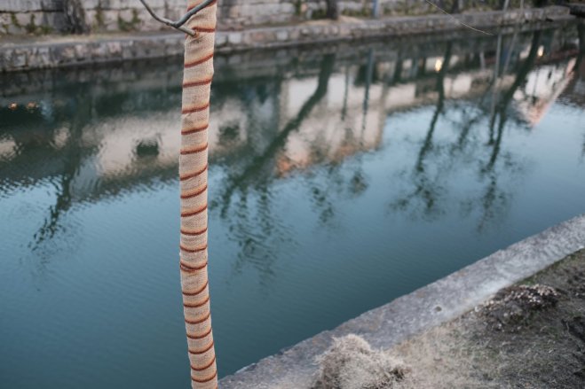 A tree with its trunk wrapped, along the canal in the Bikan district of Kurashiki, Japan.