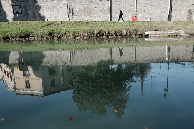 A man walking along the Canal du Midi in Carcassonne, France.