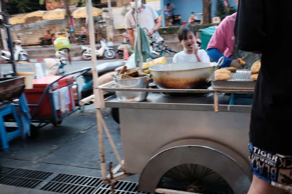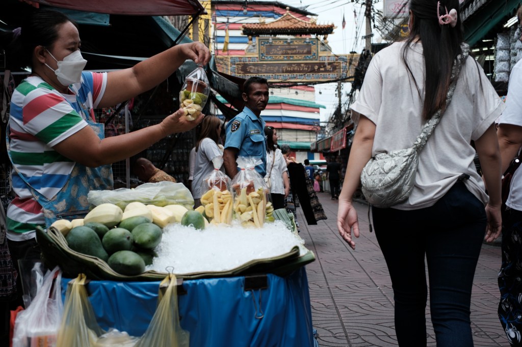 A woman holds up a bag of fruit from her cart in Bangkok, Thailand.