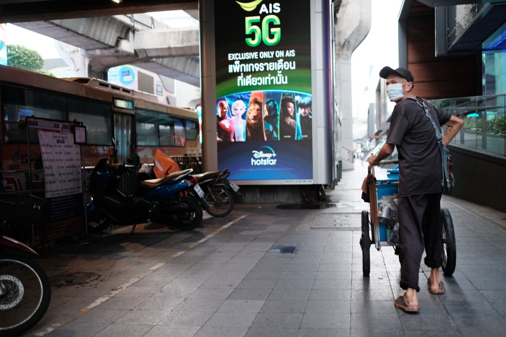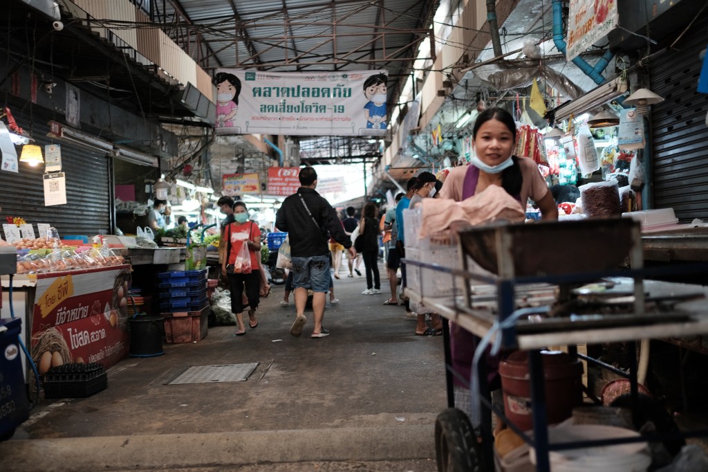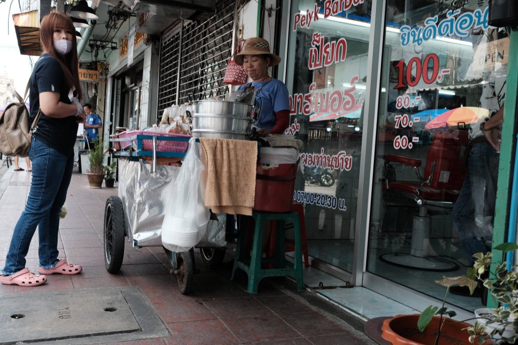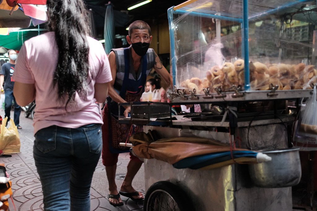 A woman holds up a bag of fruit from her cart in Bangkok, Thailand.