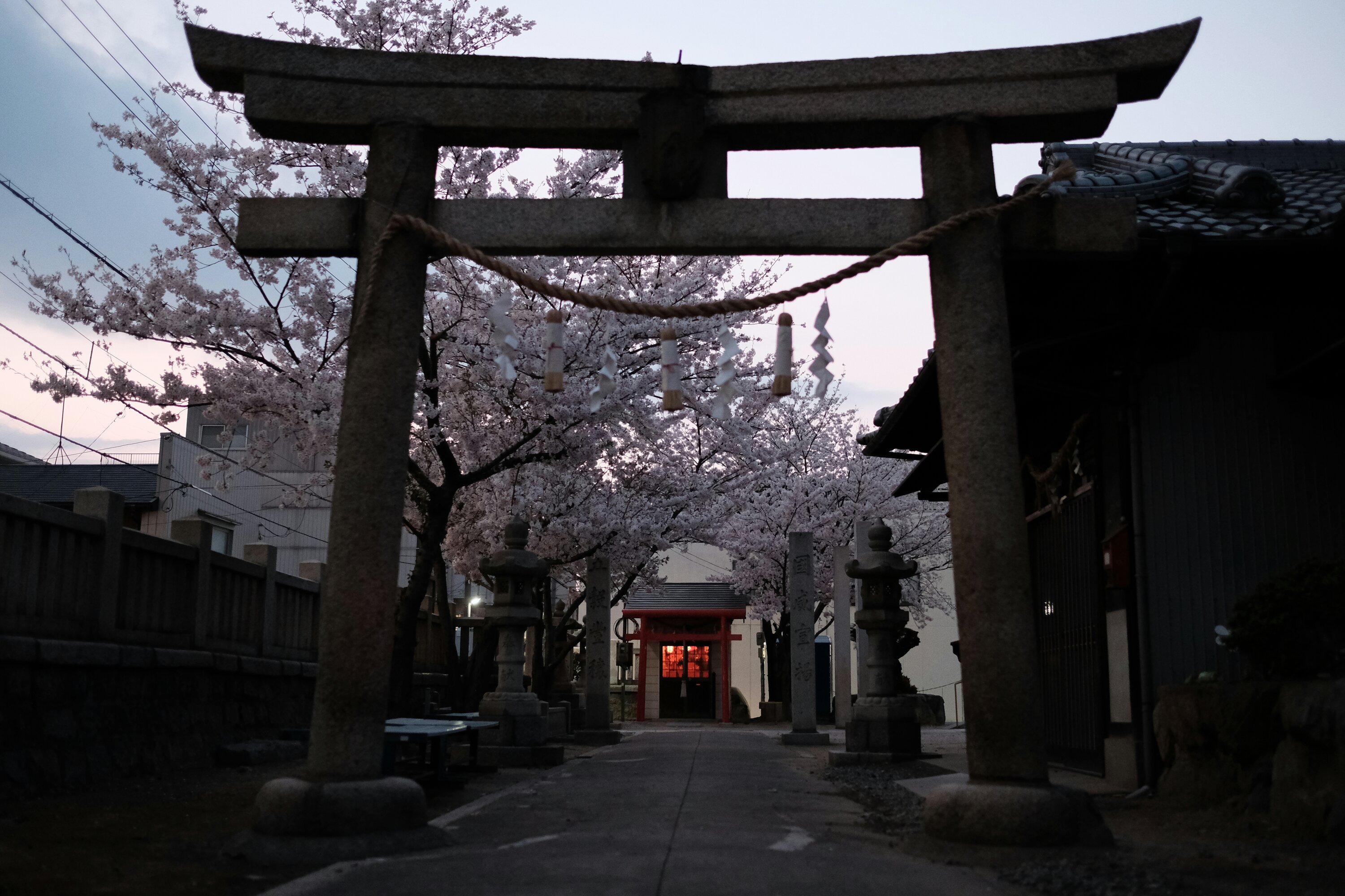 Cherry blossoms and shrine light, Takamatsu, Japan Cherry blossoms and a small shrine with a glowing red light at Kitahamaebisu-jinja, in Takamatsu, Japan.