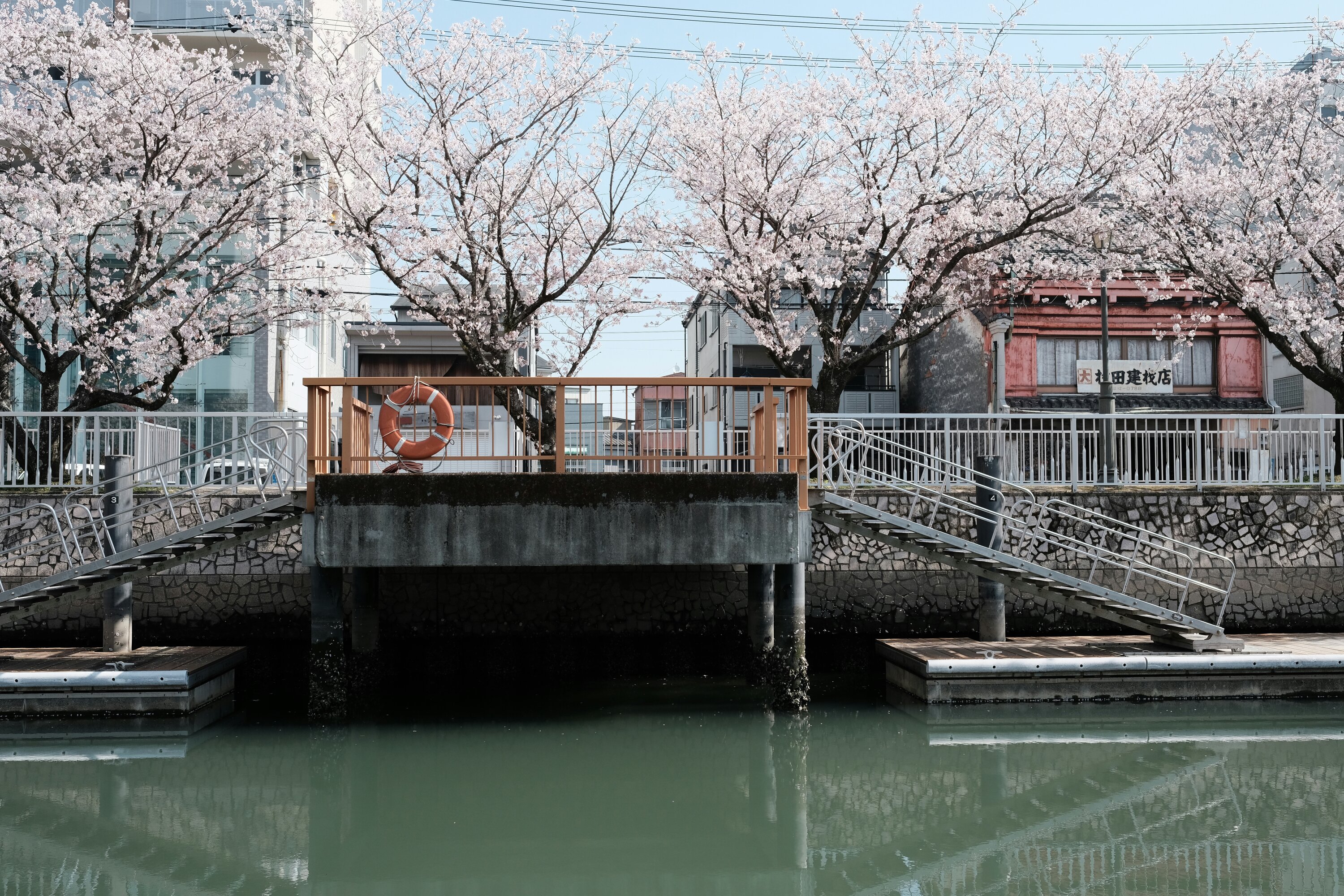 Cherry blossoms and flotation ring, Kōchi, Japan Cherry blossom trees bloom behind a pier running along a canal in Kōchi, Japan.