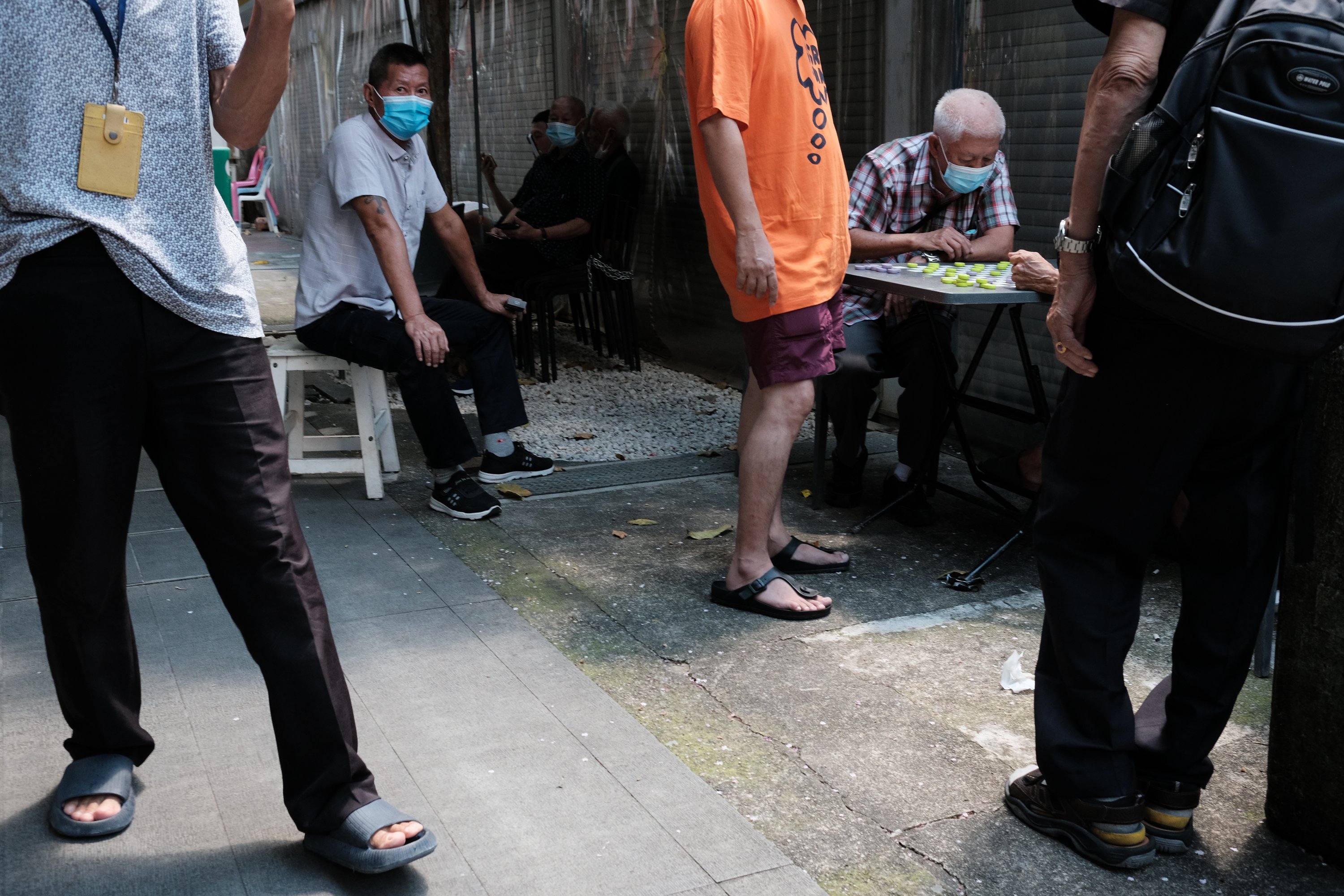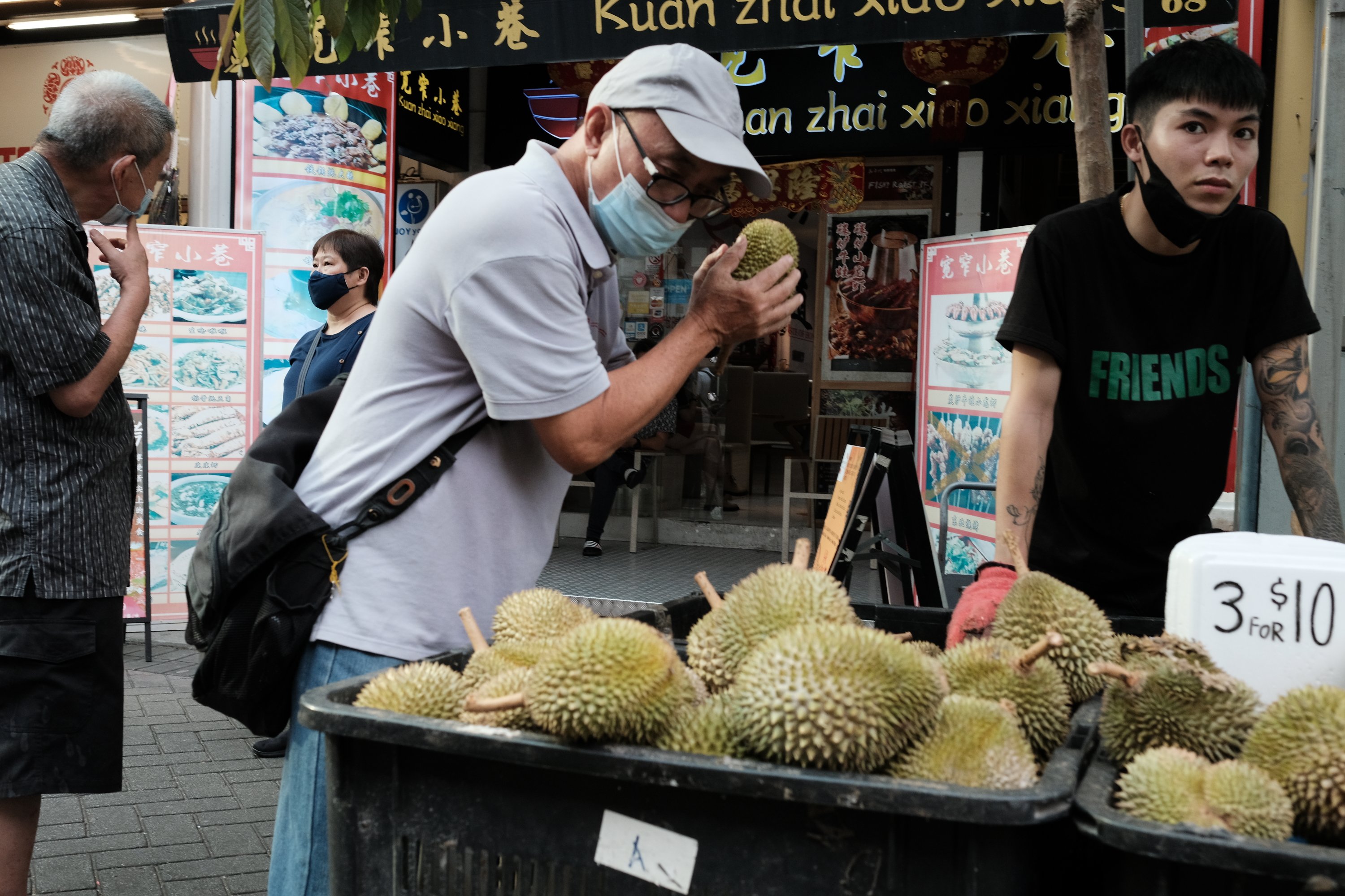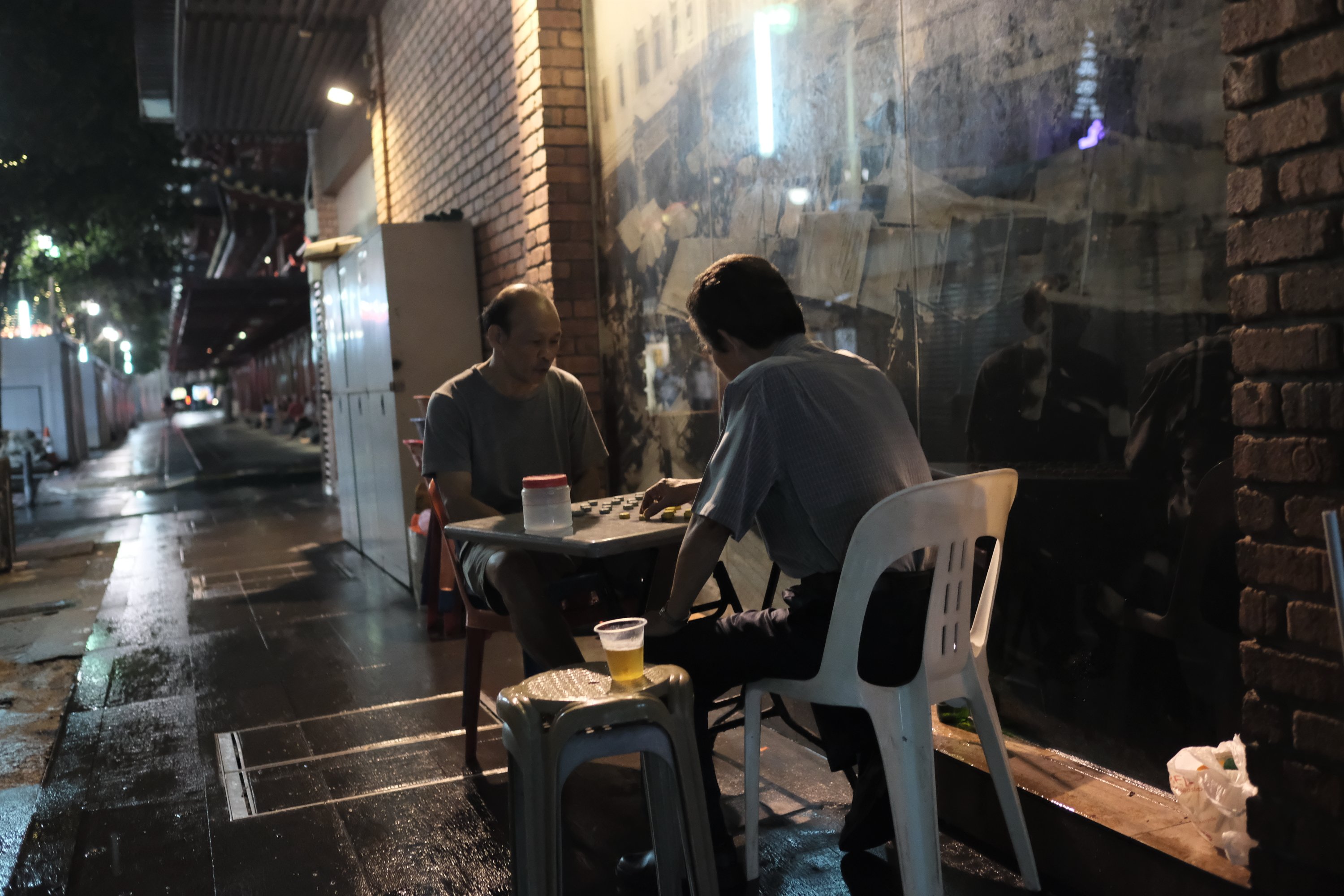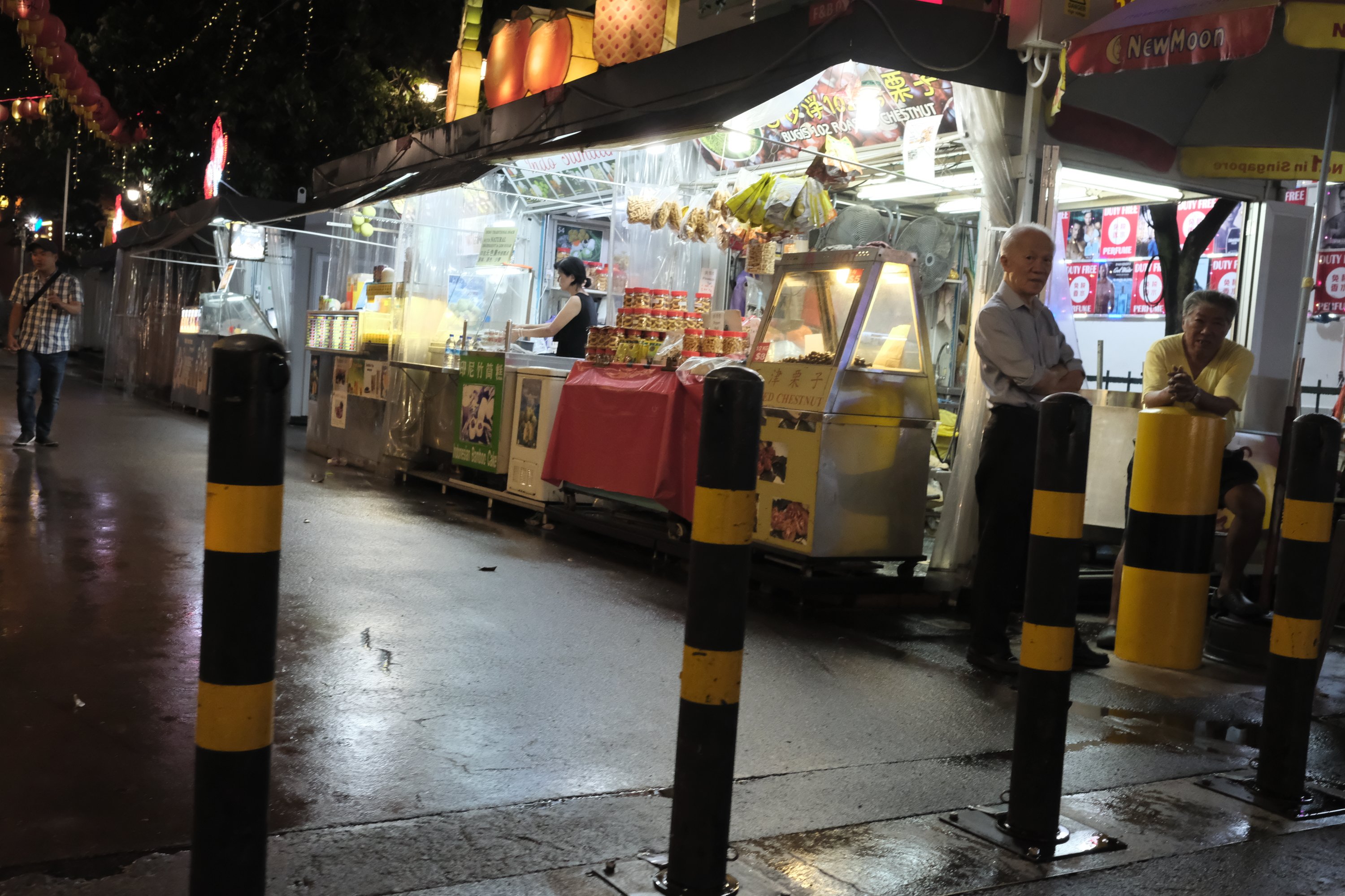 Two men standing by food stalls, Singapore Two men standing by a row of food stalls in Chinatown, Singapore.