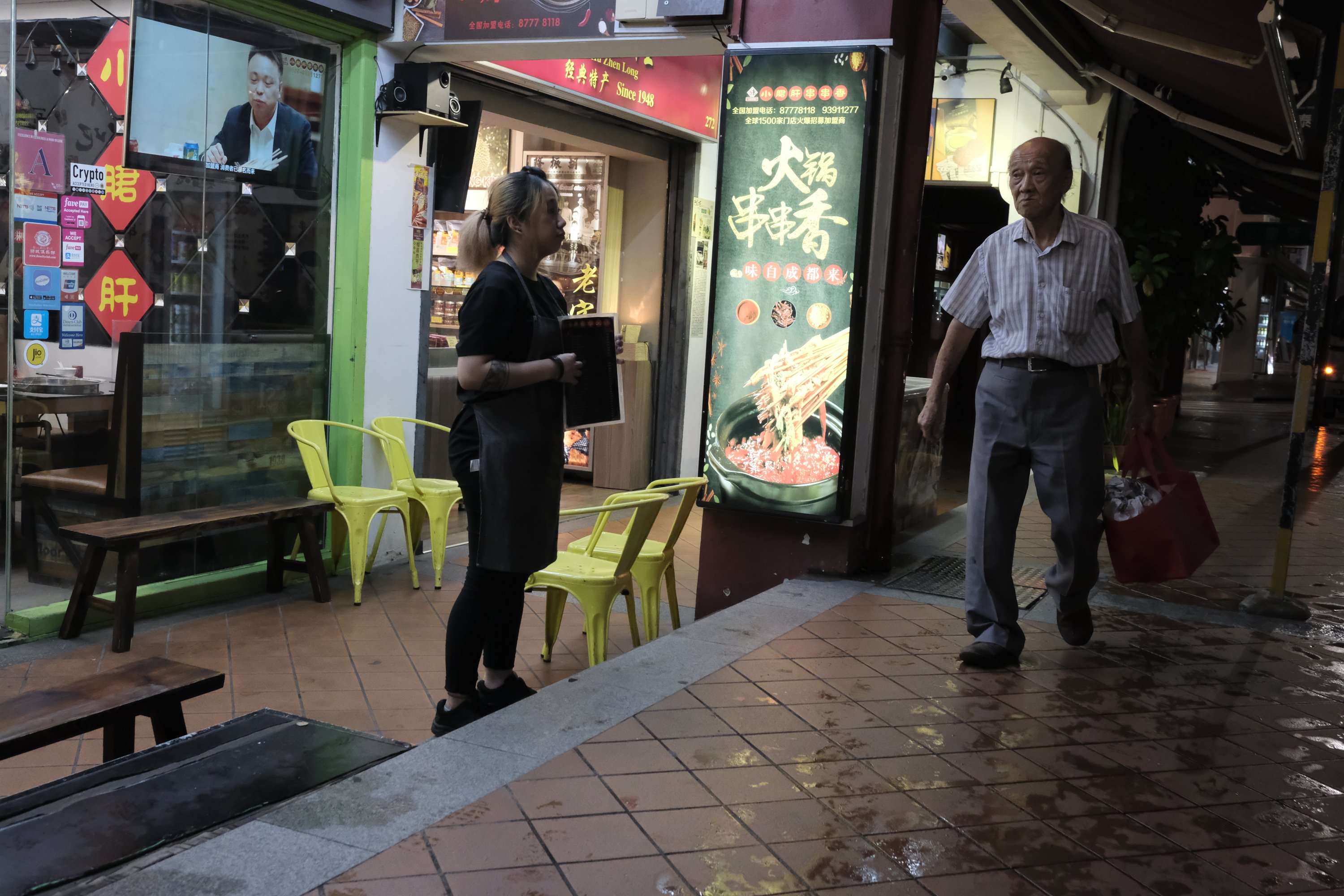 Waitress and passerby, Singapore A waitress outside a restaurant and a passerby, in Chinatown, Singapore.