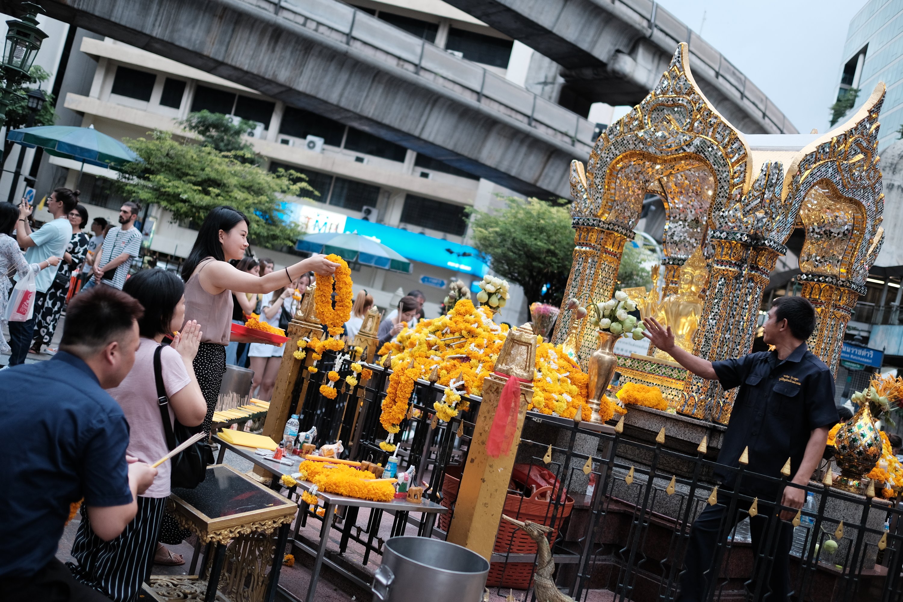 Offerings at the Erawan Shrine, Bangkok, Thailand A lady makes an offering of a flower garland at the Erawan Shrine, in Bangkok, Thailand.