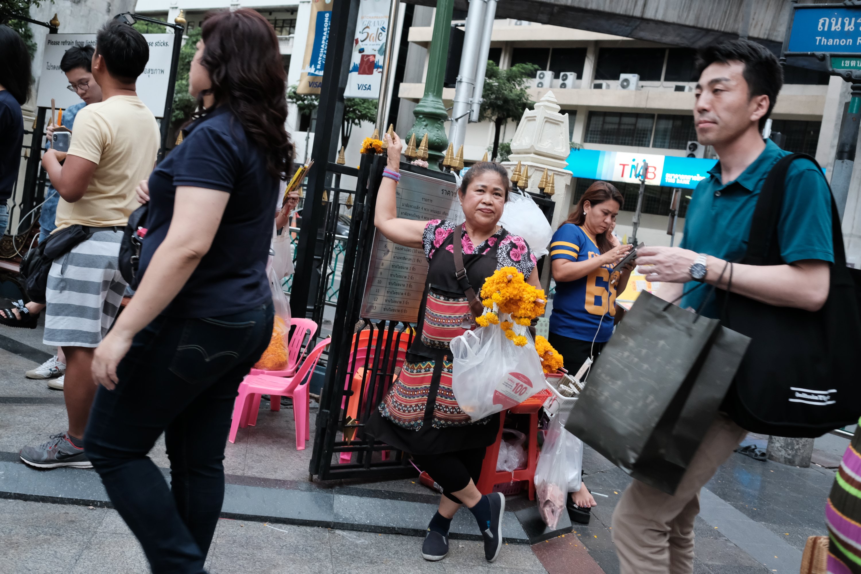 Lady selling flower garlands, Bangkok, Thailand A lady selling flower garlands at the entrance to the Erawan Shrine in Bangkok, Thailand.