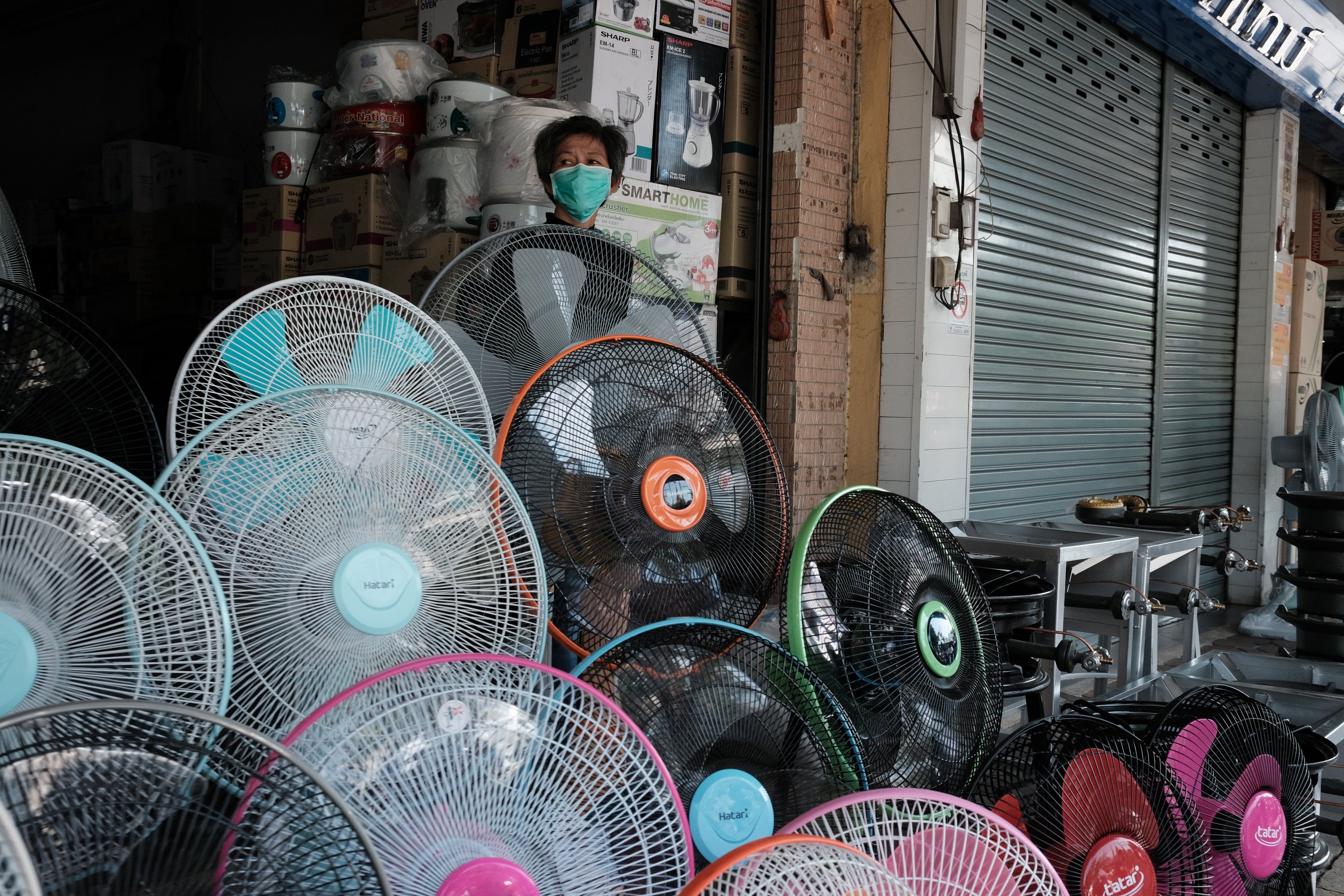 Japanese fans, Washington DC, USA Japanese fans with various shades of blue on exhibit at the Kennedy Center in Washington DC, USA.