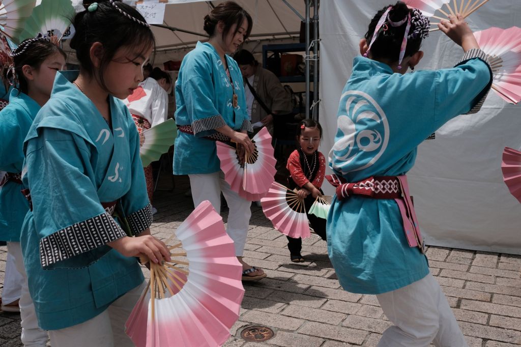 Little girl dancing with fans, Sendai, Japan A little girl dancing at the Sendai Aoba Matsuri in Sendai, Japan.