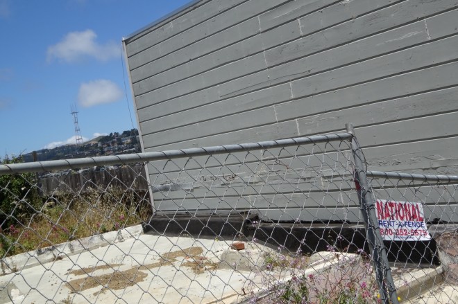 A weathered fence on the roof of a house in the Diamond Heights neighborhood of San Francisco, USA.