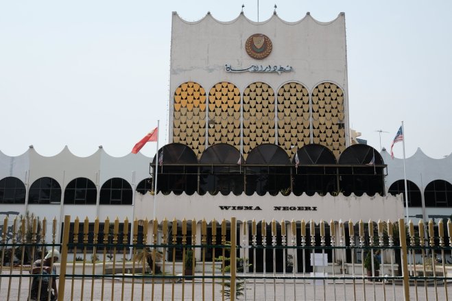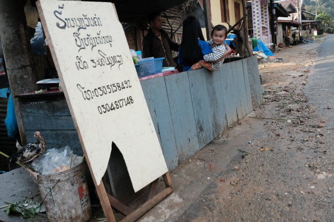 A baby sitting on a fence in Nong Khiaw, Laos.