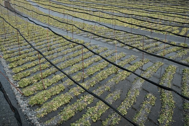 A field of wasabi plants growing at the Daiō Wasabi Farm in Hotaka, Japan.