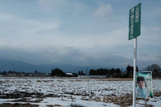 Signs posted along a quiet road through snow-covered fields in Hotaka, Japan.