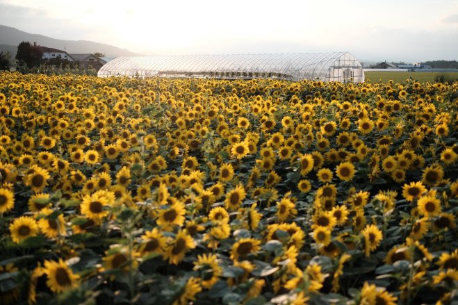 A field of sunflowers on a farm in Asahikawa, Japan.