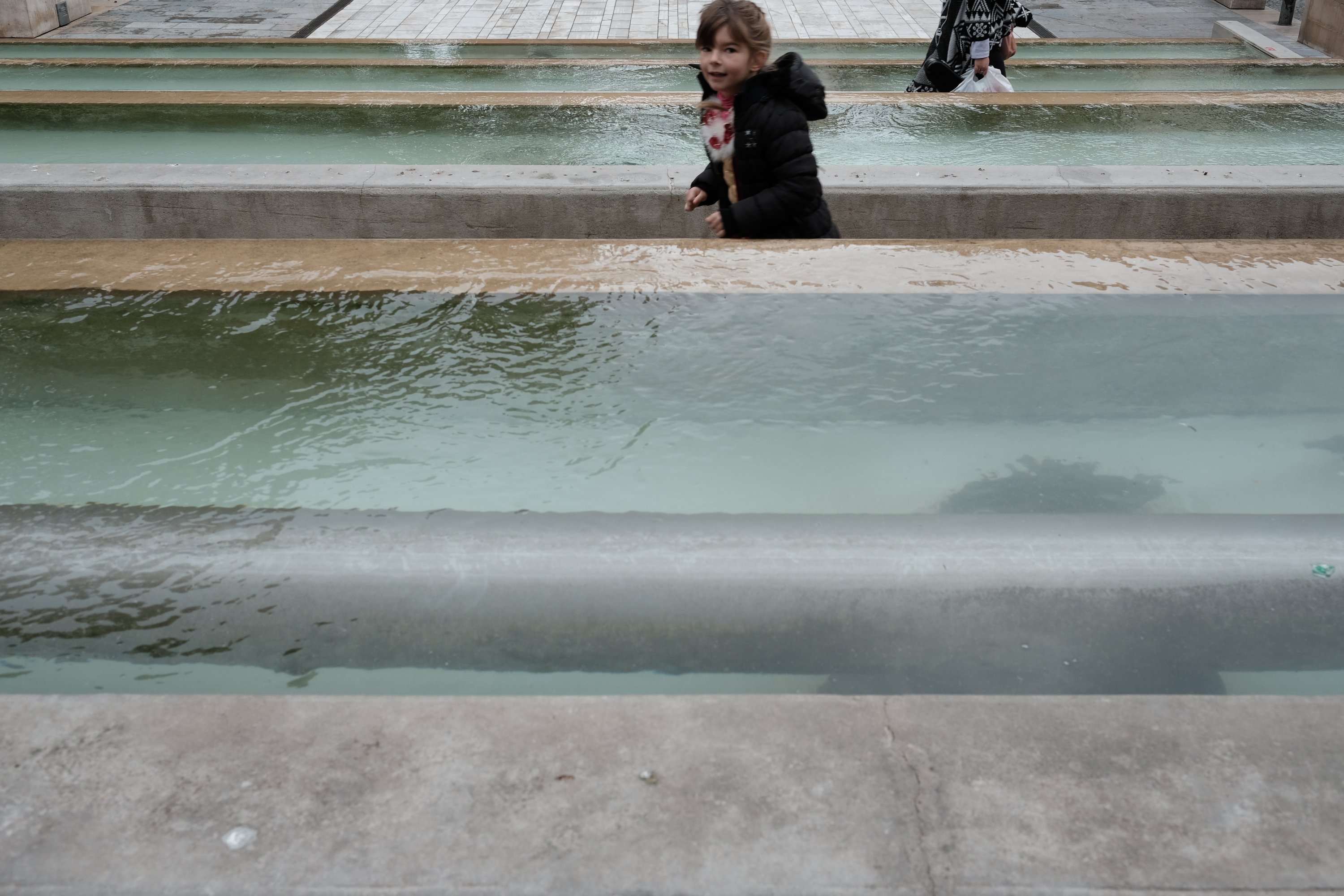 Girl running by fountain, Nîmes, France A girl runs by the fountain at Place du Chapitre in Nîmes, France.