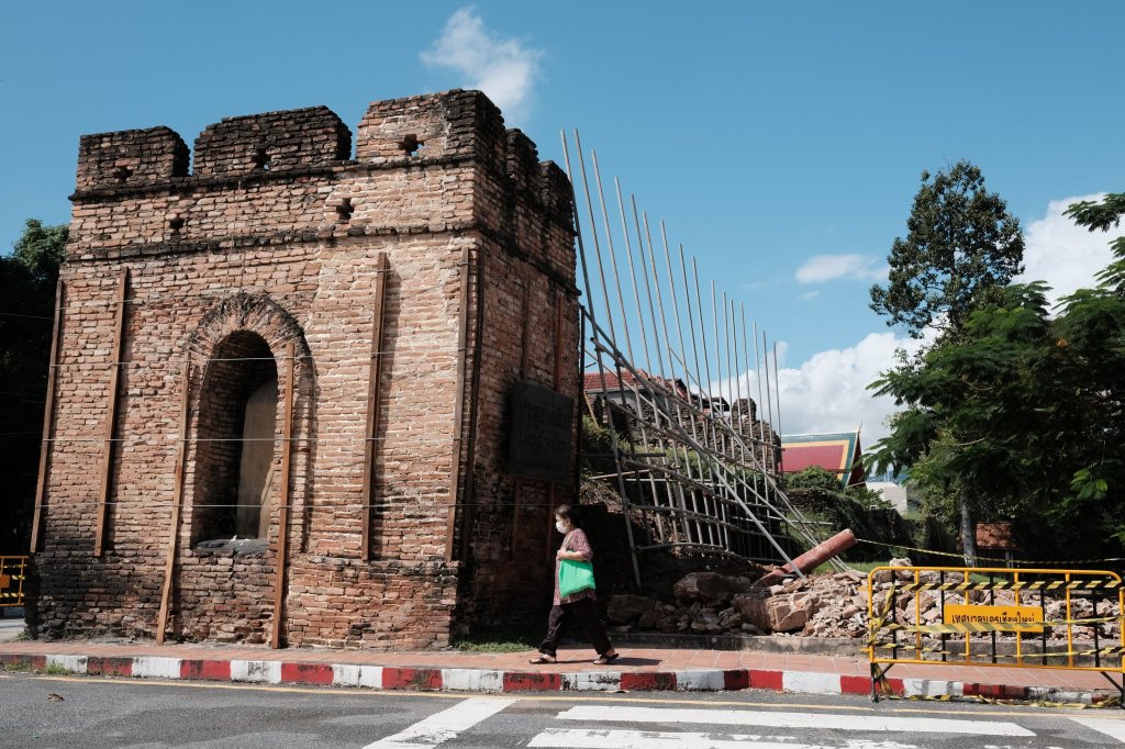 A lady walking by Wat Mangkon in Bangkok, Thailand.