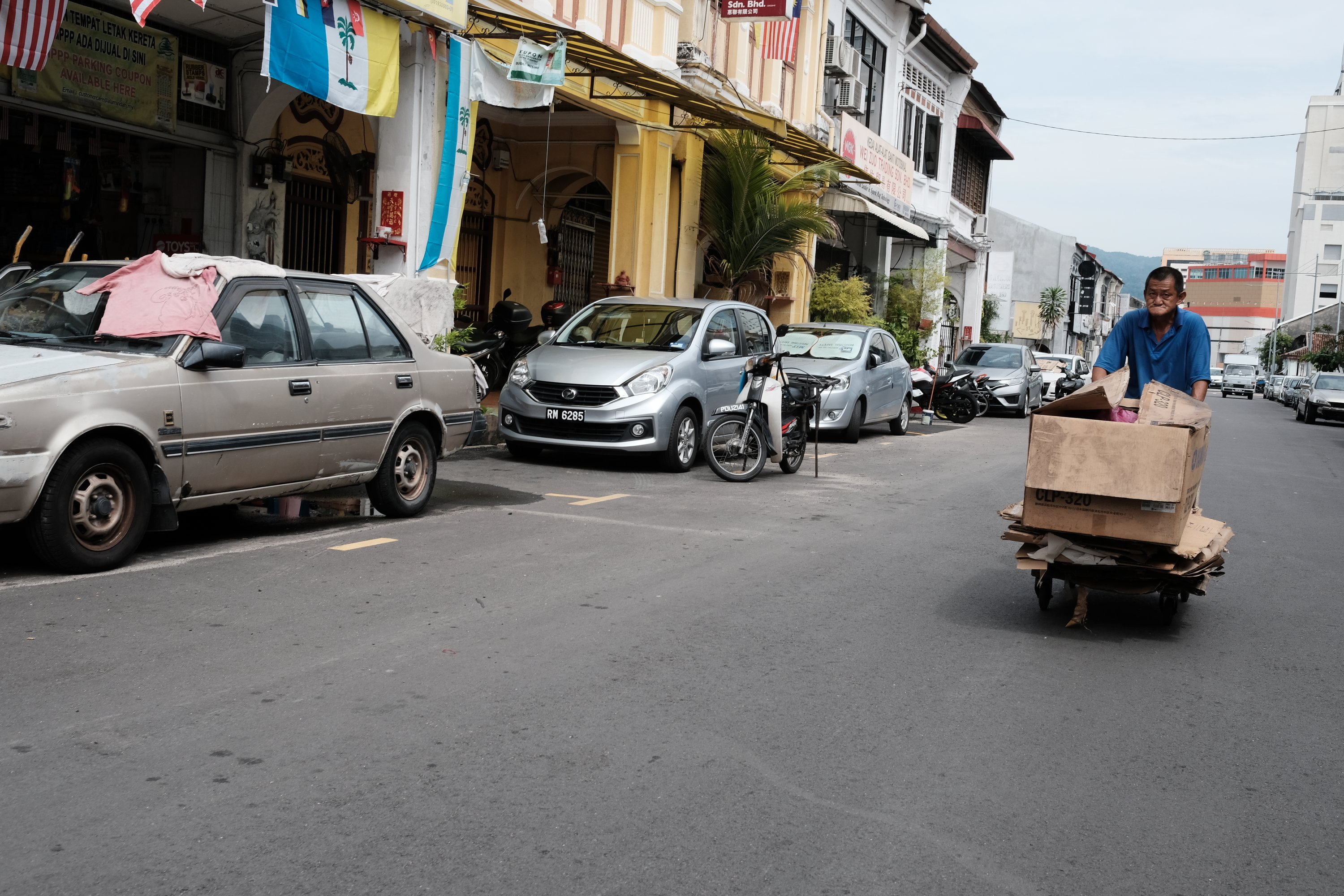 Man pushing cardboard box, George Town, Malaysia A man pushing cardboard boxes on a cart through the streets of George Town, Malaysia.