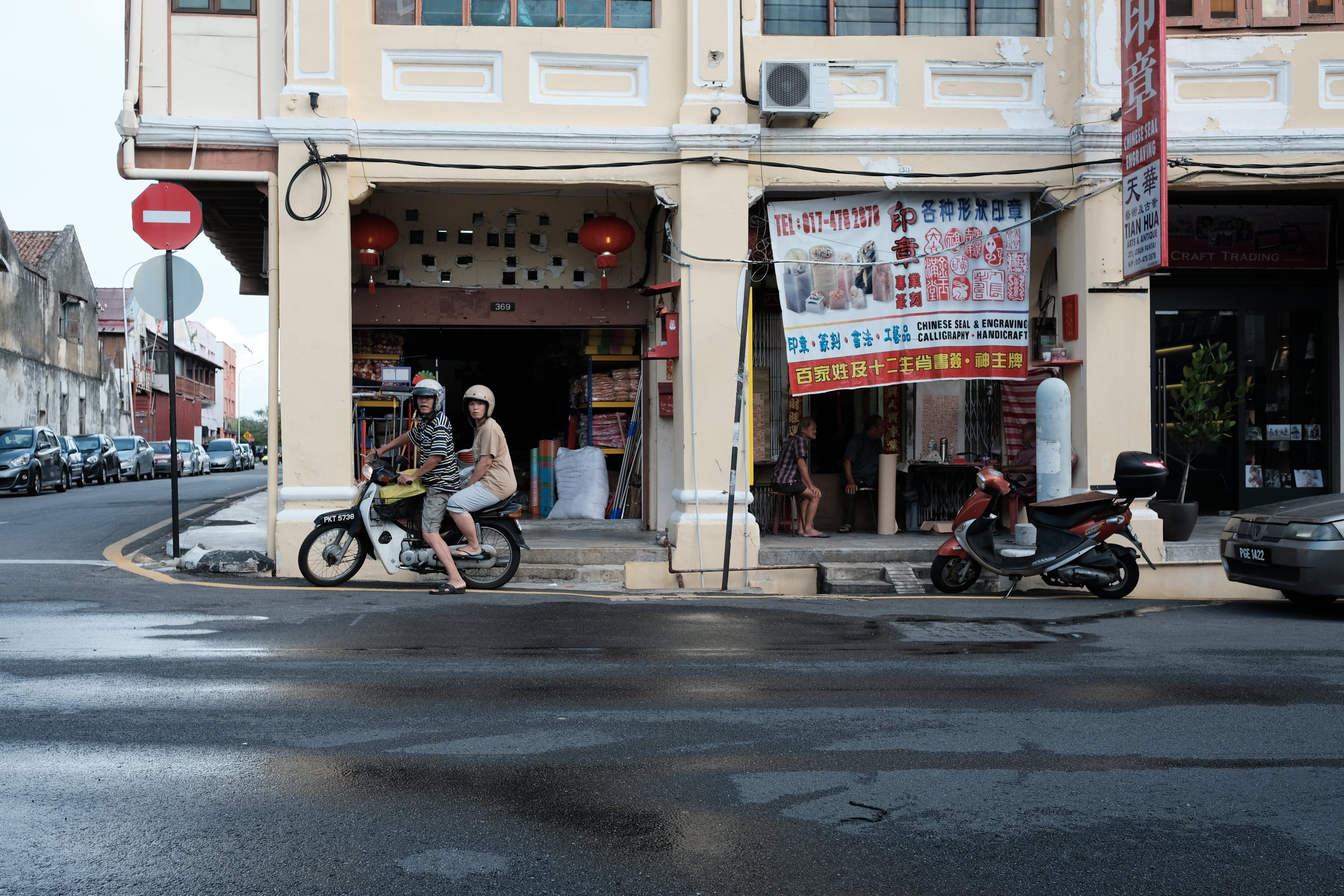 Couple on a motorbike, George Town, Malaysia A couple on a motorbike about to drive off, in George Town, Malaysia.