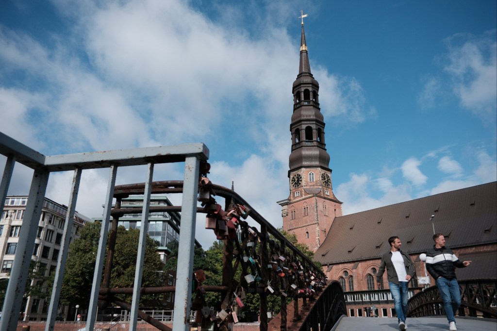 A man walks across a bridge in Speicherstadt, Hamburg, Germany.