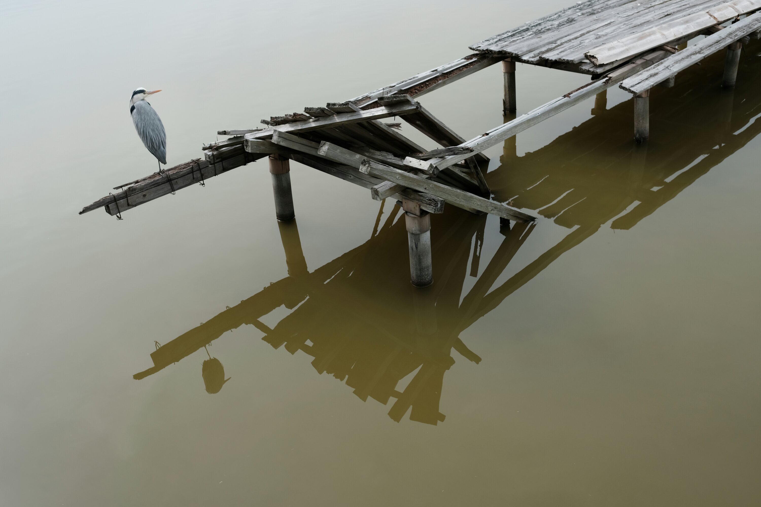 A heron and Megane-bashi, Nagasaki, Japan A heron searches for food near Megane-bashi in Nagasaki, Japan.