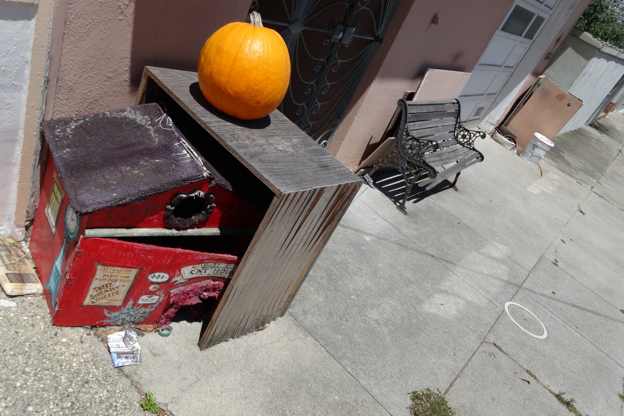 Cat house and pumpkin, San Francisco, USA A cat house and pumpkin found on the sidewalk in the Excelsior district of San Francisco, USA.