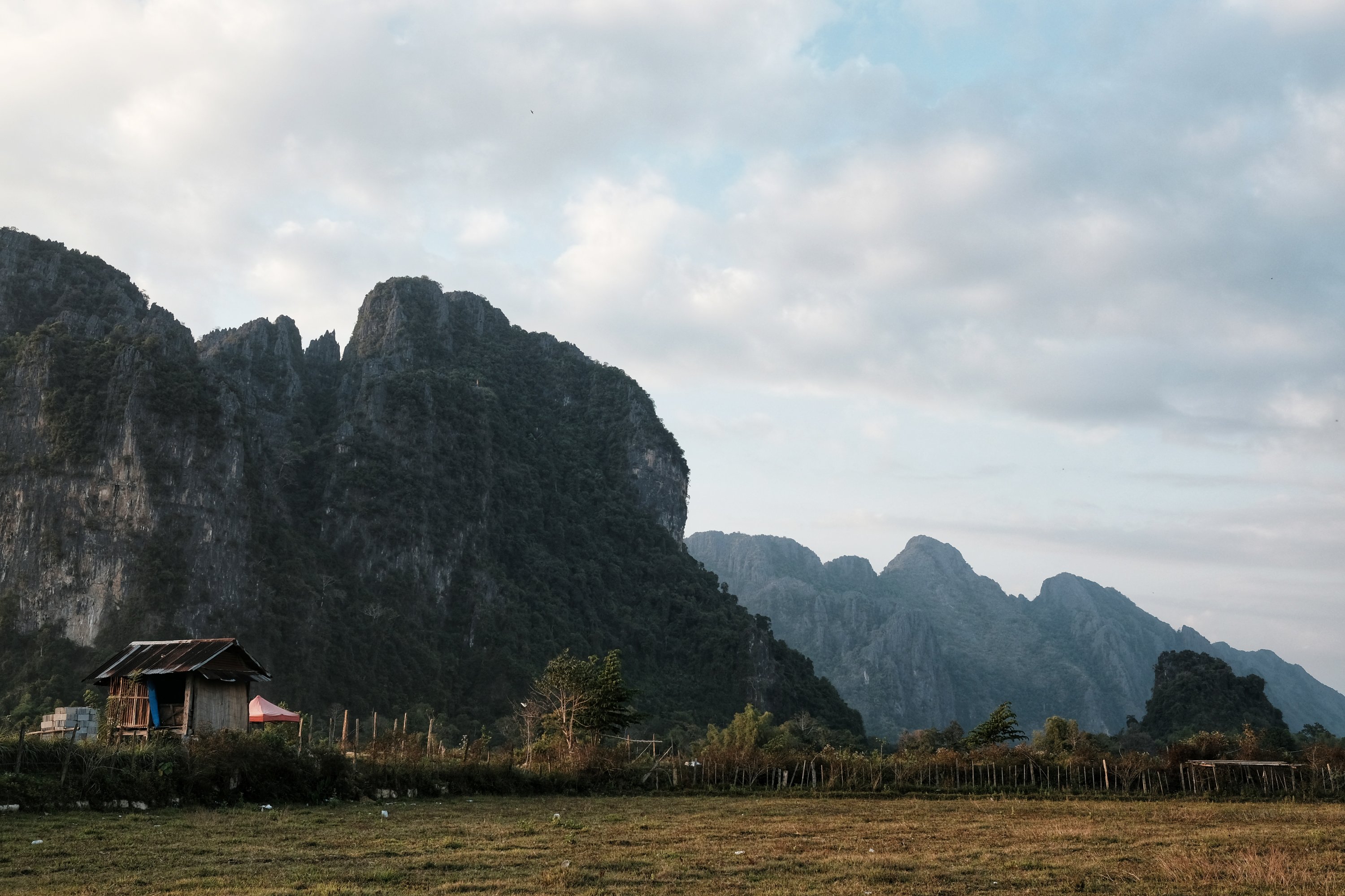 Shed and karst mountains, Vang Vieng, Laos A shed in a field surrounded by karst mountains near Vang Vieng, Laos.