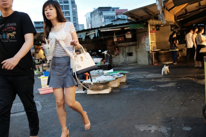 At the market, Hsinchu, Taiwan A couple and a dog and some other people at a market in Hsinchu, Taiwan.