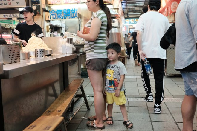 Boy in yellow shorts, Hsinchu, Taiwan A boy in yellow shorts waits with his mom at the Chenghuang Temple Night Market in Hsinchu, Taiwan.