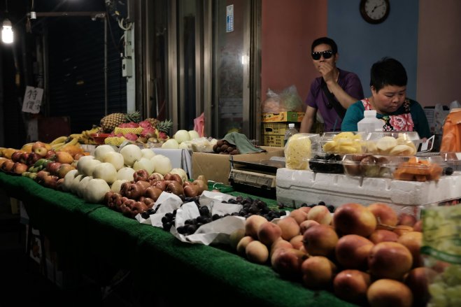 Man wearing sunglasses, Hsinchu, Taiwan A man wearing sunglasses at night behind a fruit stand in Hsinchu, Taiwan.