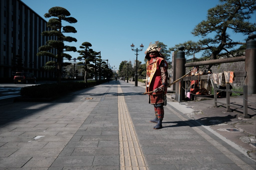 A man sweeping the tram tracks in Kagoshima, Japan.