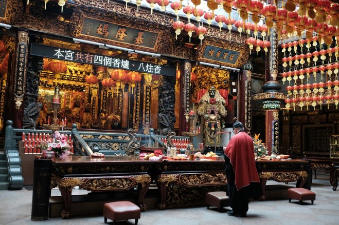 Qingan Temple ceremony, Keelung, Taiwan A man conducts a ceremony inside Qingan Temple in Keelung, Taiwan.